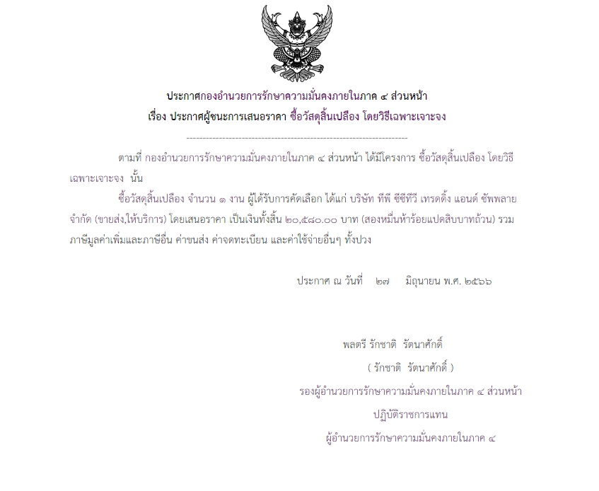 ประกาศผู้ชนะการเสนอราคา ซื้อวัสดุสิ้นเปลือง โดยวิธีเฉพาะเจาะจง