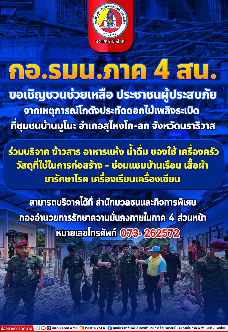สามารถบริจาคได้ที่ สำนักมวลชนและกิจการพิเศษ กองอำนวยการรักษาความมั่นคงภายในภาค 4 ส่วนหน้า หมายเลขโทรศัพท์ 073- 262572