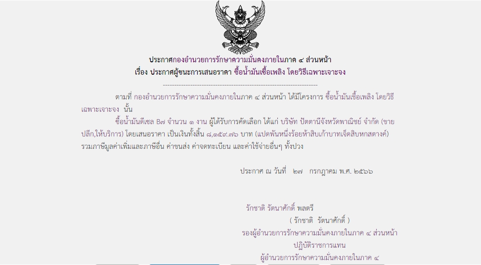 จัดซื้อ จัดจ้างประกาศผู้ชนะการเสนอราคา ประกาศผู้ชนะการเสนอราคา ซื้อน้ำมันเชื้อเพลิง โดยวิธีเฉพาะเจาะจง August 3, 2023 374 Share Facebook Twitter Google+ Telegram LINE