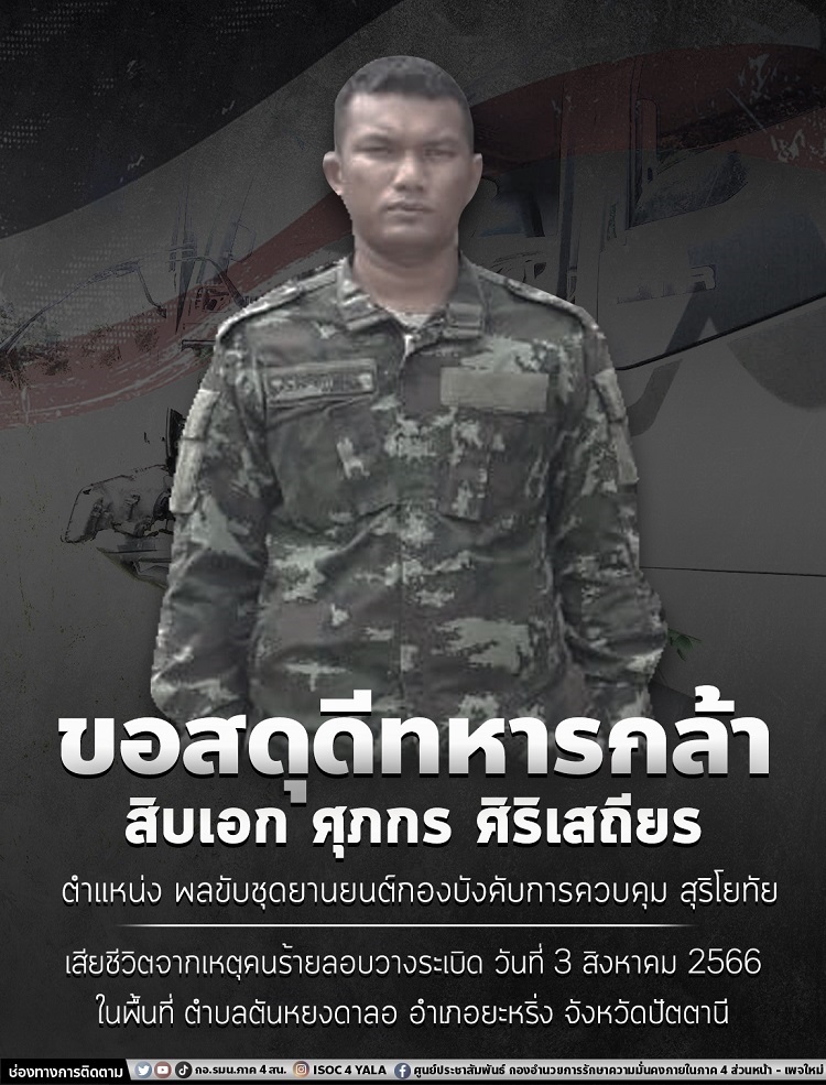 สิบเอก ศุภกร ศิริเสถียร สังกัดปกติ กรมทหารราบที่ 151 ตำแหน่ง พลขับชุดยานยนต์กองบังคับการควบคุม สุริโยทัย เสียชีวิตจากเหตุคนร้ายลอบวางระเบิด วันที่ 3 สิงหาคม 2566 ในพื้นที่ ตำบลตันหยงดาลอ อำเภอยะหริ่ง จังหวัดปัตตานี