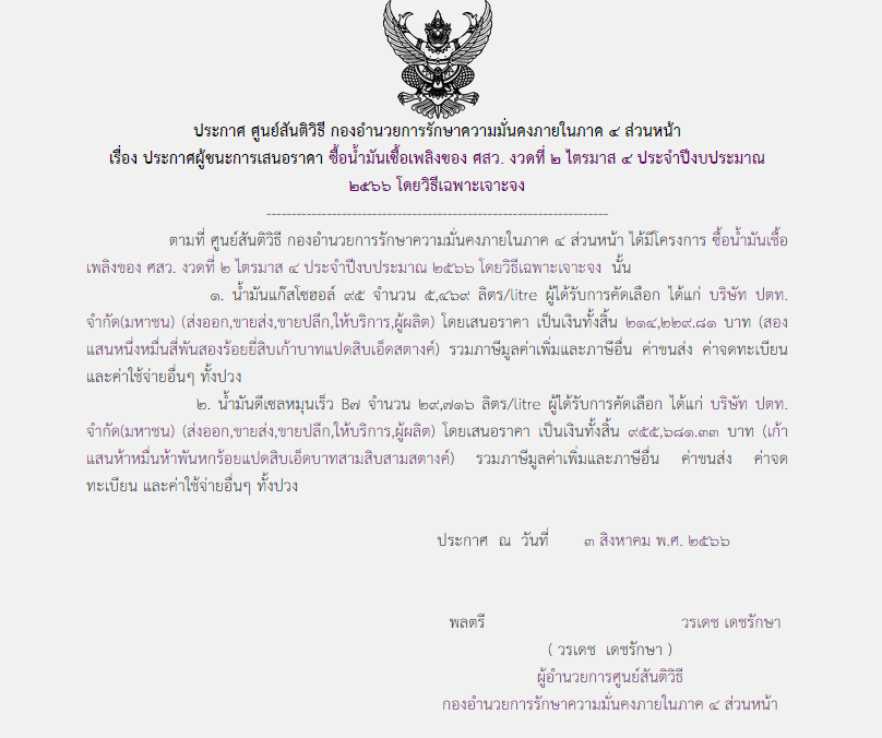 จัดซื้อ จัดจ้างประกาศผู้ชนะการเสนอราคา ประกาศผู้ชนะการเสนอราคา ซื้อน้ำมันเชื้อเพลิงของ ศสว. งวดที่ ๒ ไตรมาส ๔ ประจำปีงบประมาณ ๒๕๖๖ โดยวิธีเฉพาะเจาะจง August 5, 2023 454 Share Facebook Twitter Google+ Telegram LINE