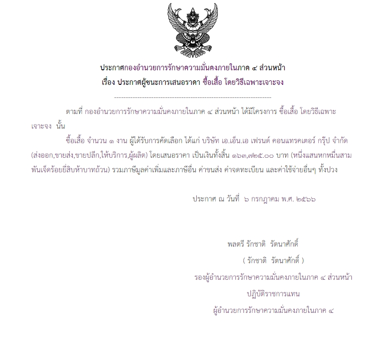 ประกาศผู้ชนะการเสนอราคา ซื้อเสื้อ โดยวิธีเฉพาะเจาะจง
