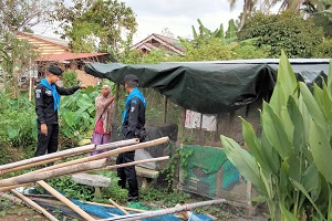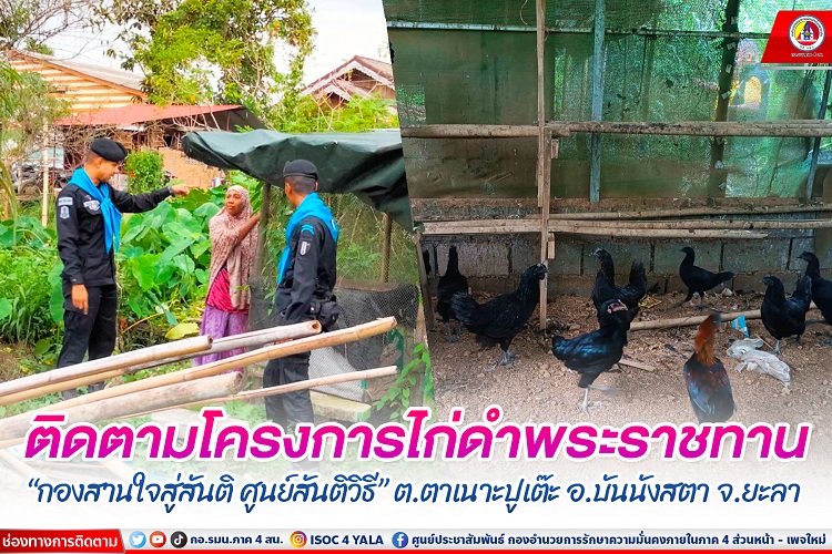 เมื่อวันที่ 6 สิงหาคม 2566 เวลา 15.00 น. ชุดปฏิบัติการกิจการพลเรือน กองร้อยทหารพรานที่ 4106 หน่วยเฉพาะกิจกรมทหารพรานที่ 41 ลงพื้นที่ติดตามโครงการไก่ดำพระราชทาน “กองสานใจสู่สันติ ศูนย์สันติวิธี” โดยการขับเคลื่อนงานสานใจสู่สันติและศูนย์ประชาชนพันธุ์ดี ณ บ้านเลขที่ 15/5 บ้านกาสัง หมู่ที่ 3 ตำบลตาเนาะปูเต๊ะ อำเภอบันนังสตา จังหวัดยะลา เพื่อติดตามความคืบหน้า และให้คำเเนะนำการเลี้ยงไก่กระดูกดำ ไก่พระราชทานของศูนย์การเรียนรู้ระดับตำบล เพื่อให้คนในชุมชนสามารถนำไปต่อยอดและประยุกต์ใช้กับชีวิตประจำวัน นำไปสู่การพัฒนาคุณภาพชีวิต สร้างอาชีพเสริม เพิ่มรายได้ให้กับครอบครัวและชุมชนในพื้นที่ ตำบลตาเนาะปูเต๊ะ อำเภอบันนังสตา จังหวัดยะลา อย่างยั่งยืน