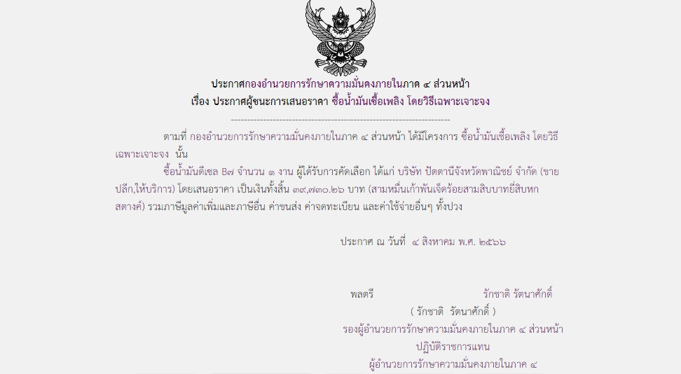 ประกาศผู้ชนะการเสนอราคา ซื้อน้ำมันเชื้อเพลิง โดยวิธีเฉพาะเจาะจง