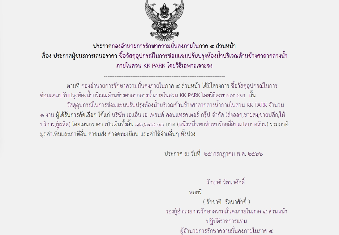 จัดซื้อ จัดจ้างประกาศผู้ชนะการเสนอราคา ประกาศผู้ชนะการเสนอราคา ซื้อวัสดุอุปกรณ์ในการซ่อมแซมปรับปรุงห้องน้ำบริเวณด้านข้างศาลากลางน้ำภายในสวน KK PARK โดยวิธีเฉพาะเจาะจง August 9, 2023 341 Share Facebook Twitter Google+ Telegram LINE