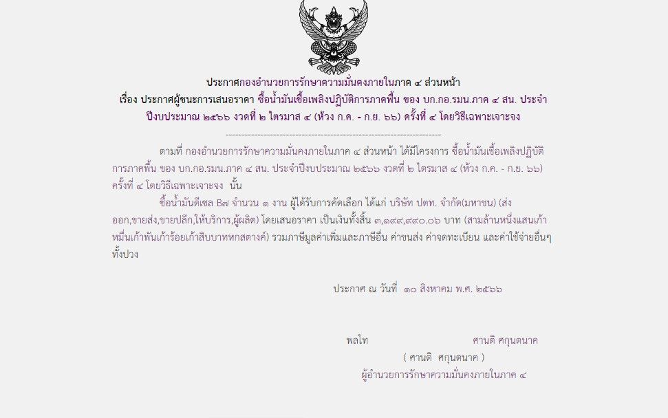จัดซื้อ จัดจ้างประกาศผู้ชนะการเสนอราคา ประกาศผู้ชนะการเสนอราคา ซื้อน้ำมันชื้อเพลิงปฏิบัติการภาคฟื้น ของ บก.กอ.รมน.ภาค ๔ สน. ประจำ ปีงบประมาณ ๒๕๖๖ งวดที่ ๒ ไตรมาส ๔ (ห้วง ก.ค. – ก.ย. ๖๖) ครั้งที่ ๔ โดยวิธีเฉพาะเจาะจง August 10, 2023 471 Share Facebook Twitter Google+ Telegram LINE