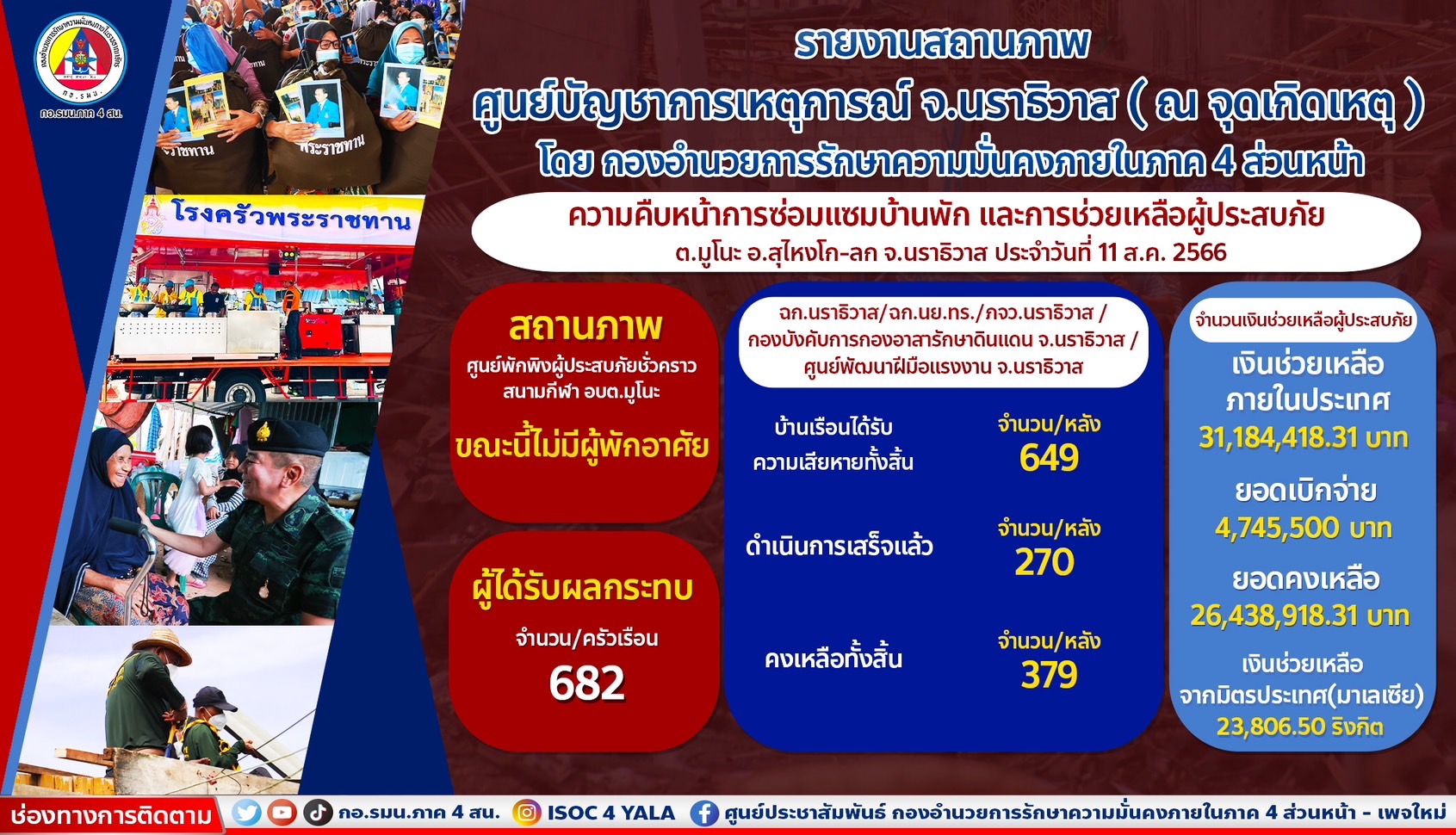 กองอำนวยการรักษาความมั่นคงภายในภาค 4 ส่วนหน้า โดยหน่วยเฉพาะกิจนราธิวาส , หน่วยเฉพาะกิจนาวิกโยธิน กองทัพเรือ, ตำรวจภูธรจังหวัดนราธิวาส ,กองบังคับการกองอาสารักษาดินแดน จังหวัดนราธิวาส และ ศูนย์พัฒนาฝีมือแรงงาน จังหวัดนราธิวาส เร่งดำเนินการซ่อมแซมบ้านเรือนให้กับผู้ประสบภัย เพื่อบรรเทาความเดือดร้อนแก่พี่น้องชาวมูโนะ ล่าสุด วันที่ 11 สิงหาคม 2566 บ้านเรือนได้รับความเสียหายทั้งสิ้นจำนวน649 หลัง ดำเนินการเรียบร้อยแล้ว จำนวน 270 หลัง และคงเหลืออีกจำนวน 379 หลัง โดยผู้ได้รับผลกระทบจำนวน 682 ครัวเรือน