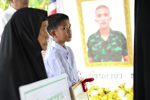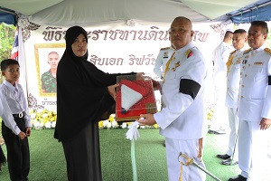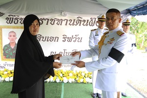 ในโอกาสนี้ ผู้ช่วยผู้บัญชาการทหารบก ประธานในพิธีฯ มอบธงชาติไทย เหรียญบางระจัน และใบประกาศเชิดชูเกียรติในการประกอบคุณงามความดี และความเสียสละ เป็นที่เชิดชูเกียรติแก่วงศ์ตระกูล พร้อมมอบเงินช่วยเหลือครอบครัวในเบื้องต้นตามสิทธิของทางราชการและสินไหมประกันชีวิตจากกองทัพบก รวมถึงจากหน่วยงานและส่วนราชการต่างๆ มอบให้แก่ครอบครัวทหารกล้าที่เสียชีวิต เพื่อเป็นการปลอบขวัญ และให้กำลังใจแก่ครอบครัว และญาติที่ต้องสูญเสียผู้เป็นที่รัก ทั้งนี้กองทัพบกได้ปูนบำเหน็จพิเศษ และขอรับพระราชทานยศสูงขึ้นเลื่อนยศ 7 ขั้น จากพลทหาร ริฟวัน เจะแล เป็น “สิบเอก ริฟวัน เจะแล” เพื่อเป็นการตอบแทนคุณความดีในการทุ่มเท รับผิดชอบในการปฎิบัติหน้าที่ และขอยกย่องในความเสียสละปฎิบัติหน้าที่เพื่อประชาชน และประเทศชาติจนวาระสุดท้ายของชีวิต