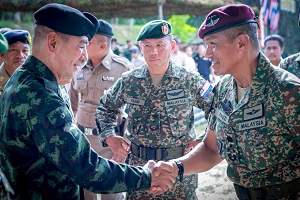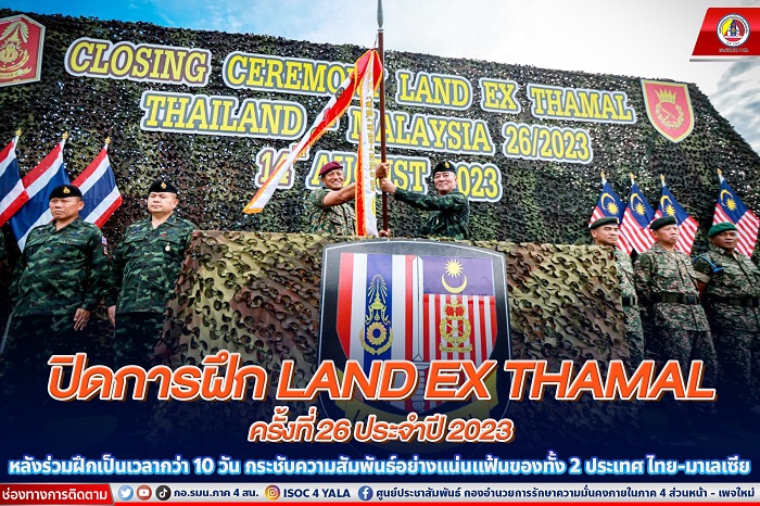 วันนี้ 14 สิงหาคม 2566 เวลา 08.00 น. ที่สนามฝึกกองพันทหารราบที่ 3 กรมทหารราบที่ 5 ค่ายมหาจักรีสิรินธร อำเภอนาทวี จังหวัดสงขลา พลโทศานติ ศกุนตนาค แม่ทัพภาคที่ 4 ประธานคณะกรรมการชายแดนส่วนภูมิภาค (กชภ.) ฝ่ายไทย เป็นประธานร่วมกับ พลโท ดาโต๊ะ เต็งกู มูฮัมหมัด เฟาซี บินเต็งกู อิบราฮิม ผู้บัญชาการกองกำลัง (กองทัพบกสนาม) ภาคตะวันตกมาเลเซีย ในพิธีปิดการฝึกร่วมระหว่างกองทัพบกไทยและกองทัพบกมาเลเซียภายใต้รหัสการฝึก LAND EX THAMAL ครั้งที่ 26 ประจำปี 2023 ที่มีกองพลทหารราบที่ 5 ฝ่ายไทยเป็นเจ้าภาพ โดยกำหนดจัดการฝึกขึ้นปีละครั้ง เพื่อเพิ่มศักยภาพและขีดความสามารถ ในการดูแลความมั่นคงตลอดแนวชายแดนไทยมาเลเซียพร้อมที่จะร่วมกันปราบปรามการกระทำผิดกฎหมายในทุกรูปแบบตามแนวชายแดนของทั้งสองประเทศ ให้เป็นไปตามยุทธวิธีและหลักนิยม ทั้งนี้ยังเป็นการปฏิบัติตามพันธกิจ 3 ประการของศูนย์ปฏิบัติการกองทัพบก ในการประสานความร่วมมือกับประเทศเพื่อนบ้าน เพื่อกระชับความสัมพันธ์อันดีระหว่างทั้ง 2 ประเทศ โดยมี พลตรี วรเดช เดชรักษา ผู้บัญชาการกองพลทหารราบที่ 5,พันเอก ฐนิตพนธ์ หงษ์วิไล ผู้บังคับการกรมทหารราบที่ 5/ผู้อำนวยการกองอำนวยการฝึกฯ และ พันโท นพรัตน์ มหัตเสน ผู้บังคับกองพันทหารราบที่ 3 กรมทหารราบที่ 5/หัวหน้าส่วนควบคุมการฝึกผสม ตลอดจนผู้เกี่ยวข้องฝ่ายมาเลเซียร่วมพิธีปิดการฝึก