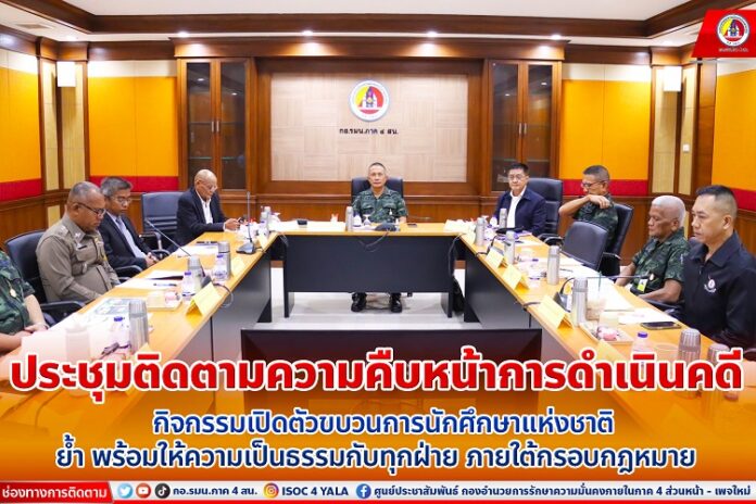ล่าสุด วันนี้ 15 สิงหาคม 2566 พลตรี ปราโมทย์ พรหมอินทร์ รองแม่ทัพภาคที่ 4 / รองผู้อำนวยการรักษาความมั่นคงภายในภาค 4 ส่วนหน้า เปิดประชุมติดตามความคืบหน้าการดำเนินคดีกับขบวนการนักศึกษาแห่งชาติ ครั้งที่ 5 โดยมี นายโสภณ ทิพย์บำรุง ที่ปรึกษาอัยการจังหวัดนราธิวาส, กองกำลังตำรวจจังหวัดชายแดนภาคใต้, เจ้าหน้าที่กลุ่มงานสอบสวนสถานีตำรวจภูธรเมืองปัตตานี และภาคส่วนที่เกี่ยวข้องร่วมประชุมติดตามความคืบหน้า ปัญหาอุปสรรค และการให้ข้อเสนอแนะแนวทางการดำเนินการ