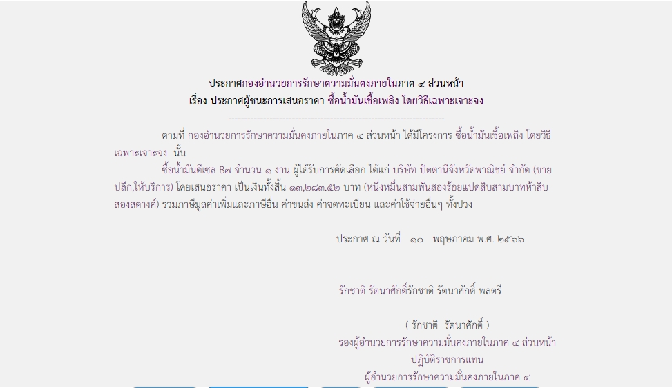 ประกาศผู้ชนะการเสนอราคา ซื้อน้ำมันเชื้อเพลิง โดยวิธีเฉพาะเจาะจง