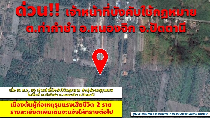 เมื่อวันที่ 16 สิงหาคม 2566 เจ้าหน้าที่บังคับใช้กฎหมายต่อกลุ่มผู้ก่อเหตุรุนแรง ในพื้นที่ หมู่ที่ 7 บ้านปาแต ตำบลท่ากำชำ อำเภอหนองจิก จังหวัดปัตตานี เบื้องต้นผู้ก่อเหตุรุนแรง เสียชีวิต 2 ราย ขณะนี้ยังไม่จบภารกิจ อยู่ระหว่างเจรจาเพื่อให้คนร้ายมอบตัว