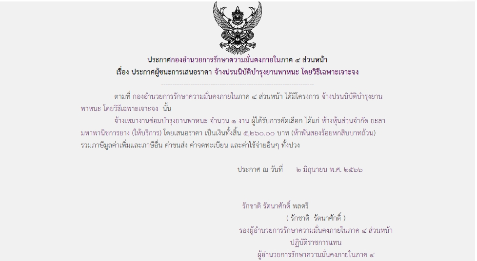 ประกาศผู้ชนะการเสนอราคา จ้างปรนนิบัติบำรุงยานพาหนะ โดยวิธีเฉพาะเจาะจง