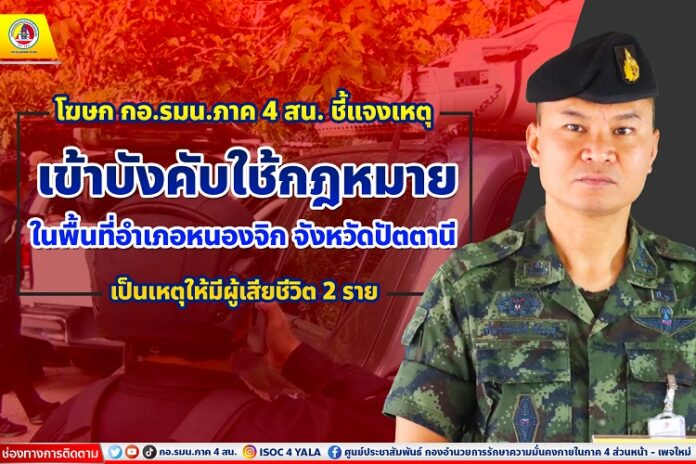 พันเอก เกียรติศักดิ์ ณีวงษ์ โฆษกกองอำนวยการรักษาความมั่นคงภายในภาค 4 ส่วนหน้า ชี้แจงเหตุการณ์เจ้าหน้าที่เข้าบังคับใช้กฎหมาย เมื่อช่วงเช้าวันที่ 16 สิงหาคม 2566 เวลา 04.00 น. หน่วยปฏิบัติการพิเศษร่วมปัตตานี ได้สนธิกำลัง 3 ฝ่าย เข้าบังคับใช้กฎหมายในพื้นที่ หมู่ที่ 6 บ้านปาแต ตำบลท่ากำชำ อำเภอหนองจิก จังหวัดปัตตานี หลังได้รับแจ้งเบาะแสจากประชาชนว่ามีกลุ่มผู้ก่อเหตุรุนแรงเข้ามาหลบซ่อนเพื่อเตรียมก่อเหตุในพื้นที่ดังกล่าว ทั้งนี้ในขั้นตอนการปฏิบัติ พลโท ศานติ ศกุนตนาค แม่ทัพภาคที่ 4 / ผู้อำนวยการรักษาความมั่นคงภายในภาค 4 ได้กำชับให้เจ้าหน้าที่ปฏิบัติงานด้วยความโปร่งใส เน้นการดำเนินการจากเบาไปหาหนัก และคำนึงถึงสิทธิมนุษยชนให้มากที่สุด รวมทั้งใช้ความพยายามในการเจรจาเกลี้ยกล่อมให้คนร้ายยอมออกมามอบตัวเพื่อต่อสู้ตามหลักกฎหมาย โดยเจ้าหน้าที่ได้ขอความร่วมมือผู้นำท้องที่ ผู้นำท้องถิ่น ผู้นำศาสนา และเครือญาติ ในการเป็นผู้ช่วยเจรจาเกลี้ยกล่อมให้คนร้ายที่หลบซ่อนอยู่ภายในบ้านออกมามอบตัว แต่ไม่เป็นผล เนื่องจากผู้ก่อเหตุรุนแรงได้เปิดฉากยิงใส่เจ้าหน้าที่ พร้อมทั้งพยายามวิ่งฝ่าวงล้อมเพื่อหลบหนี จึงเกิดการยิงต่อสู้กันขึ้น