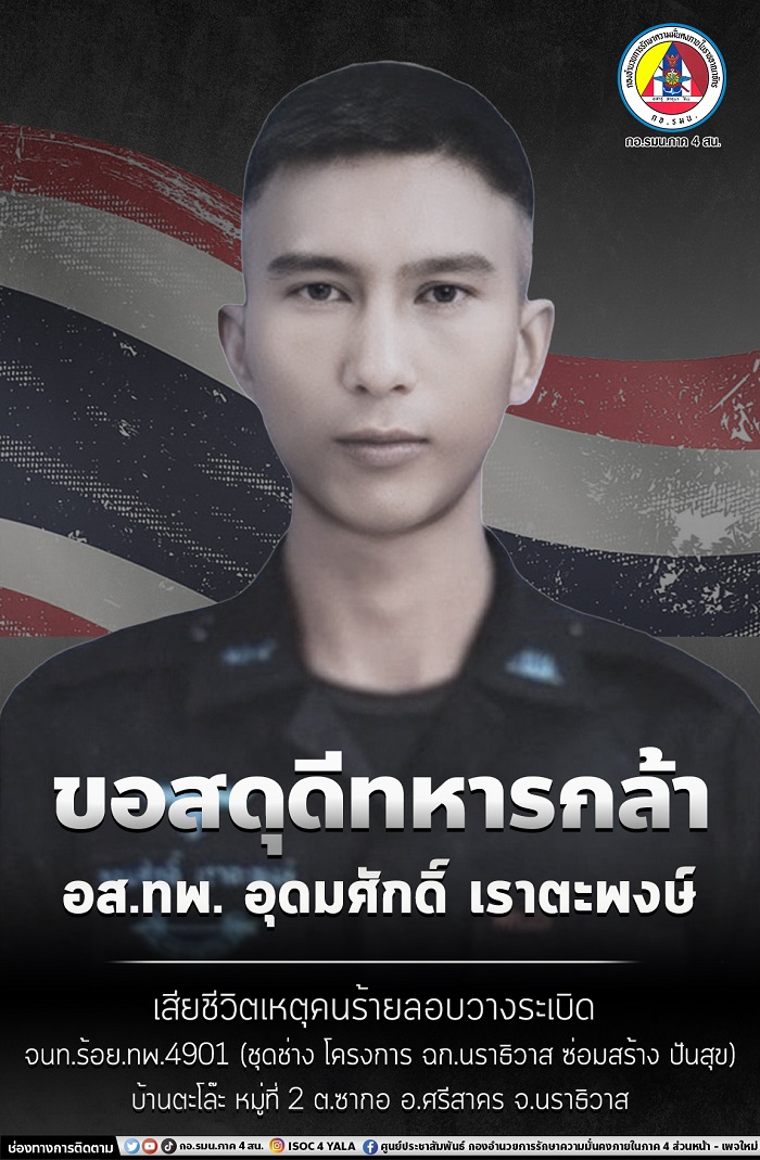 ขอแสดงความเสียใจกับครอบครัวของ อาสาสมัครทหารพราน อุดมศักดิ์ เราตะพงษ์ เจ้าหน้าที่กองร้อยทหารพรานที่ 4901 หน่วยเฉพาะกิจกรมทหารพรานที่ 49 เสียชีวิตจากเหตุคนร้ายลอบวางระเบิดเจ้าหน้าที่ชุดช่าง โครงการ ฉก.นราธิวาส ซ่อมสร้างปันสุข บริเวณพื้นที่บ้านตะโล๊ะ หมู่ที่ 2 ตำบลซากอ อำเภอศรีสาคร จังหวัดนราธิวาส เมื่อวันที่ 17 สิงหาคม 2566 ทำให้เจ้าหน้าที่ทหารพรานเสียชีวิต จำนวน 1 นาย และได้รับบาดเจ็บ จำนวน 4 นาย