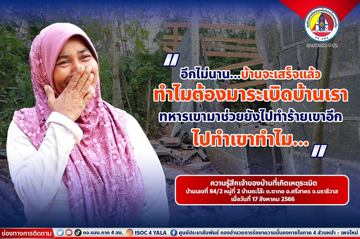 ประชาสัมพันธ์ข่าวประชาสัมพันธ์ “อีกไม่นาน…บ้านจะเสร็จแล้ว ทำไมต้องมาระเบิดบ้านเรา ทหารเขามาช่วย….. ยังไปทำร้ายเขาอีก ไปทำเขาทำไม…” August 18, 2023 389 Share Facebook Twitter Google+ Telegram LINE ความรู้สึกเจ้าของบ้านที่เกิดเหตุระเบิด บ้านเลขที่ 84/2 หมู่ที่ 2 บ้านตะโล๊ะ ต.ซากอ อ.ศรีสาคร จ.นราธิวาส เมื่อวันที่ 17 สิงหาคม 2566 ศูนย์ประชาสัมพันธ์กองอำนวยการรักษาความมั่นคงภายในภาค4ส่วนหน้า