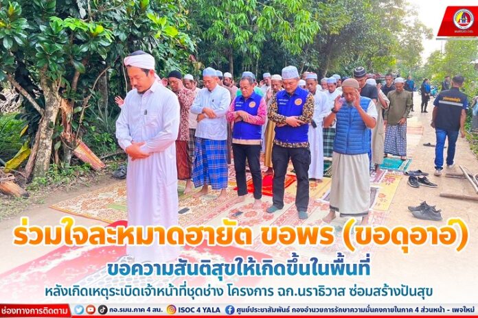 เมื่อวันที่ 18 สิงหาคม 2566 เวลา 07.00 น. ที่บ้านตะโล๊ะ หมู่ที่ 2 ตำบลซากอ อำเภอศรีสาคร จังหวัดนราธิวาส พันตรี อุดม สุวรรณโชติ หัวหน้าฝ่ายกิจการพลเรือนหน่วยเฉพาะกิจกรมทหารพรานที่ 49 พร้อมด้วย ปลัดอำเภอศรีสาคร, ผู้นำศาสนา, กำนัน, ผู้ใหญ่บ้าน และประชาชนในพื้นที่ตำบลซากอ ร่วมพิธีละหมาดฮายัต ขอพร (ขอดุอาอ์) เพื่อปัดเป่าสิ่งชั่วร้าย ขอความสันติสุขให้เกิดขึ้นในพื้นที่ สืบเนื่องจากเหตุการณ์คนร้ายลอบวางระเบิดเจ้าหน้าที่ชุดช่าง โครงการ หน่วยเฉพาะกิจนราธิวาส ซ่อมสร้างปันสุข บริเวณพื้นที่บ้านตะโล๊ะ หมู่ที่ 2 ตำบลซากอ อำเภอศรีสาคร จังหวัดนราธิวาส เมื่อวันที่ 17 สิงหาคม 2566 ทำให้เจ้าหน้าที่ทหารพรานเสียชีวิต จำนวน 1 นาย และได้รับบาดเจ็บ จำนวน 4 นาย ที่ผ่านมา เพื่อร่วมแสดงพลังต่อต้านการก่อเหตุรุนแรงในพื้นที่และต้องการอยู่ร่วมกันสร้างสันติสุข
