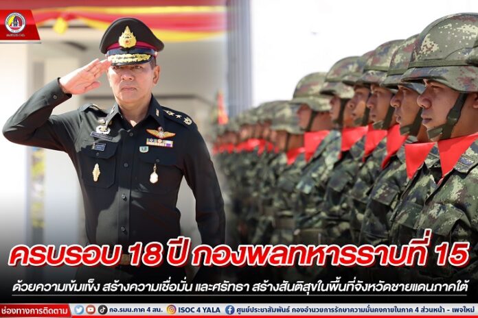 วันนี้ (19 สิงหาคม 2566) เวลา 09.00 น. ที่ แหล่งสมาคมนายทหารสัญญาบัตร กองบัญชาการกองพลทหารราบที่ 15 ค่ายสมเด็จพระสุริโยทัย ตำบลบ่อทอง อำเภอหนองจิก จังหวัดปัตตานี พลโท ศานติ ศกุนตนาค แม่ทัพภาคที่ 4 / ผู้อำนวยการรักษาความมั่นคงภายในภาค 4 เป็นประธานในพิธีทางศาสนา เนื่องในวันสถาปนา กองพลทหารราบที่ 15 ครบรอบปีที่ 18 รำลึกถึงเกียรติประวัติ และคุณงามความดีของหน่วย โดยมี พลตรี เฉลิมพร ขำเขียว ผู้บัญชาการกองพลทหารราบที่ 15, คุณสมฤดี ขำเขียว ประธานสมาคมแม่บ้านทหารบก สาขา กองพลทหารราบที่ 15, รองผู้ว่าราชการจังหวัดปัตตานี, ผู้บังคับบัญชา, หัวหน้าส่วนราชการ, สมาคมแม่บ้านทหารบก สาขา กองพลทหาราบที่ 15, ตลอดจนกำลังพลและครอบครัวภายในหน่วย เข้าร่วมพิธีเป็นจำนวนมาก