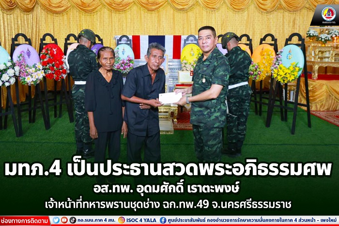 เมื่อวันที่ 19 สิงหาคม 2566 เวลา 18.00 น. ณ บ้านเลขที่ 13 หมู่ที่ 4 ตำบลบางนบ อำเภอหัวไทร จังหวัดนครศรีธรรมราช พลโท ศานติ ศกุนตนาค แม่ทัพภาคที่ 4 / ผู้อำนวยรักษาความมั่นคงภายในภาค 4 เป็นประธานในพิธีสวดพระอภิธรรมศพ อาสาสมัครทหารพราน อุดมศักดิ์ เราตะพงษ์ เจ้าหน้าที่ทหารพรานชุดช่าง สังกัดกองร้อยทหารพรานที่ 4901 หน่วยเฉพาะกิจกรมทหารพรานที่ 49 ซึ่งเสียชีวิตจากเหตุระเบิด ขณะกำลังสร้างบ้านให้กับประชาชน ตามโครงการหน่วยเฉพาะกิจนรา ซ่อมสร้างปันสุข ณ บ้านเลขที่ 84/2 หมู่ที่ 2 บ้านตะโล๊ะ ตำบลซากอ อำเภอศรีสาคร จังหวัดนราธิวาส เมื่อวันที่ 17 สิงหาคม 2566 ที่ผ่านมา โดยมี ผู้บังคับบัญชา กำลังพลเพื่อนทหาร รวมไปถึงคณะญาติ และพี่น้องประชาชนในพื้นที่ เข้าร่วมพิธีสวดพระอภิธรรม แสดงความไว้อาลัยต่อวีรชนผู้กล้า
