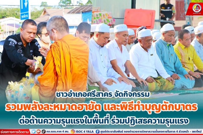 วันนี้ (21 สิงหาคม 2566) เวลา 07.00 น. ณ บริเวณหน้าโรงพยาบาลศรีสาคร อำเภอศรีสาคร จังหวัดนราธิวาส ชาวอำเภอศรีสาคร ร่วมกับ หน่วยเฉพาะกิจกรมทหารพรานที่ 49 จัดกิจกรรมรวมพลังละหมาดฮายัตต่อต้านความรุนแรงในพื้นที่ ร่วมปฏิเสธความรุนแรง ขอพรจากองค์อัลลอฮ์ ช่วยดลบันดาลยุติความรุนแรงในพื้นที่ หลังเกิดเหตุการณ์คนร้ายลอบวางระเบิดเจ้าหน้าที่ชุดช่าง โครงการ “หน่วยเฉพาะกิจนราธิวาส ซ่อมสร้างปันสุข” เหตุเกิดในพื้นที่บ้านตะโล๊ะ หมู่ที่ 2 ตำบลซากอ อำเภอศรีสาคร จังหวัดนราธิวาส เมื่อวันที่ 17 สิงหาคม 2566 ที่ผ่านมา ทำให้เจ้าหน้าที่ทหารพราน กองร้อย ทหารพรานที่ 4901 หน่วยเฉพาะกิจกรมทหารพรานที่ 49 เสียชีวิตทันที 1 นาย และได้รับบาดเจ็บ จำนวน 4 นาย โดยมี หัวหน้าส่วนราชการ, ผู้นำท้องที่, ผู้นำท้องถิ่น, ผู้นำศาสนา และประชาชนในพื้นที่ร่วมกิจกรรม กว่า 400 คน