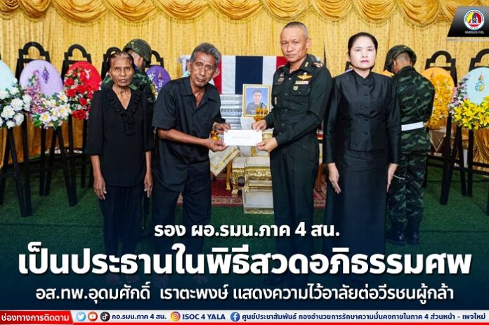 เมื่อวันที่ 21 สิงหาคม 2566 เวลา 19.00 น. ณ บ้านเลขที่ 13 หมู่ที่ 4 ตำบลบางนบ อำเภอหัวไทร จังหวัดนครศรีธรรมราช พลตรี รักชาติ รัตนาศักดิ์ ผู้บัญชาการมณฑลทหารบกที่ 43 / รองผู้อำนวยการรักษาความมั่นคงภายในภาค 4 ส่วนหน้า เป็นประธานในพิธีสวดอภิธรรมศพ อาสาสมัครทหารพราน อุดมศักดิ์ เราตะพงษ์ เจ้าหน้าที่ทหารพรานชุดช่าง สังกัดกองร้อยทหารพรานที่ 4901 หน่วยเฉพาะกิจกรมทหารพรานที่ 49 ซึ่งเสียชีวิตจากเหตุระเบิด ขณะกำลังสร้างบ้านให้กับประชาชน ตามโครงการหน่วยเฉพาะกิจนรา ซ่อมสร้างปันสุข ณ บ้านเลขที่ 84/2 หมู่ที่ 2 บ้านตะโล๊ะ ตำบลซากอ อำเภอศรีสาคร จังหวัดนราธิวาส เมื่อวันที่ 17 สิงหาคม 2566 ที่ผ่านมา โดยมี ข้าราชการ ทหาร ตำรวจ ฝ่ายปกครอง ตลอดจนครอบครัวและญาติของผู้เสียชีวิต ร่วมพิธีสวดพระอภิธรรม แสดงความไว้อาลัยต่อวีรชนผู้กล้า