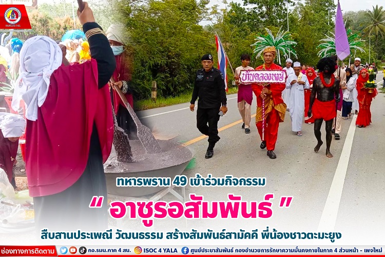 เมื่อวันที่ 24 สิงหาคม 2566 เวลา 10.00 น. ณ ชุมชนบ้านคลองหงษ์ หมู่ที่ 3 ตำบลตะมะยูง อำเภอศรีสาคร จังหวัดนราธิวาส ร้อยโท สุภาพ เชาวลิต ผู้บังคับกองร้อยทหารพรานที่ 4915 หน่วยเฉพาะกิจกรมทหารพรานที่ 49 พร้อมด้วย หัวหน้าชุดปฏิบัติการกิจการพลเรือน กำลังพลชุดปฏิบัติการกิจการพลเรือนที่ 4915 ร่วมกับ ผู้นำศาสนา , ผู้นำท้องที่ , ผู้นำท้องถิ่น , หัวหน้าส่วนราชการในพื้นที่ , กลุ่มสตรี และกลุ่มเยาวชนในพื้นที่ เข้าร่วมกิจกรรม “อาซูรอสัมพันธ์” สืบสานประเพณี วัฒนธรรม สร้างสัมพันธ์สามัคคี พี่น้องชาวตะมะยูง เพื่อส่งเสริมให้เยาวชนและประชาชนตำบลตะมะยูง มีกิจกรรมร่วมกันด้วยการทำขนมกวนอาซูรอ เสริมสร้างสังคมแห่งความร่วมมือ มีการแบ่งปันกัน และสร้างความใกล้ชิดระหว่างหน่วยงานในท้องถิ่นกับประชาชนในพื้นที่ โดยใช้มิติของวัฒนธรรมและประเพณีท้องถิ่น ส่งเสริมให้เยาวชน ประชาชน ร่วมเรียนรู้อนุรักษ์วัฒนธรรมประเพณีการทำขนมอาซูรอ ที่มีคุณค่าทางสารอาหาร ประหยัด ดำเนินชีวิตสอดคล้องกับการนำหลักปรัชญาของเศรษฐกิจพอเพียง ตามแนวทางพระราชดำริ พระบาทสมเด็จพระปรมินทรมหาภูมิพลอดุลยเดช ในหลวงรัชกาลที่ 9 อีกทั้ง “เข้าใจ เข้าถึง พัฒนา” พัฒนาสัมพันธ์ เสริมสร้างความเข้าใจกับประชาชนในพื้นที่อย่างยั่งยืน