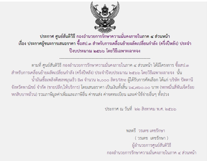 จัดซื้อ จัดจ้างประกาศผู้ชนะการเสนอราคา ประกาศผู้ชนะการเสนอราคา ซื้อ สป.๓ สำหรับการเคลื่อนย้ายผลัดเปลี่ยนกำลัง (ครึ่งปีหลัง) ประจำปีงบประมาณ ๒๕๖๖ โดยวิธีเฉพาะเจาะจง August 25, 2023 451 Share Facebook Twitter Google+ Telegram LINE