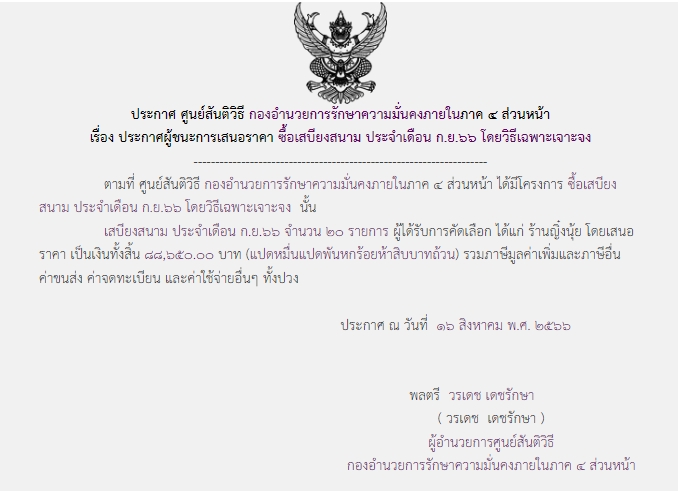 ประกาศผู้ชนะการเสนอราคา ซื้อเสบียงสนาม ประจำเดือน ก.ย.๖๖ โดยวิธีเฉพาะเจาะจง