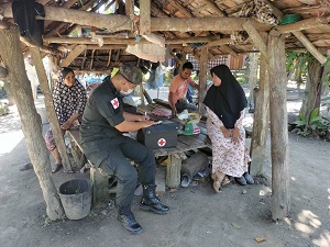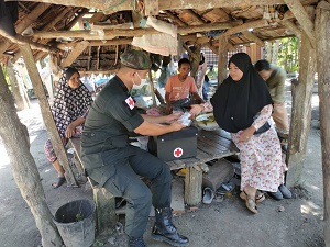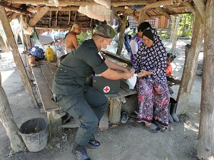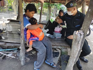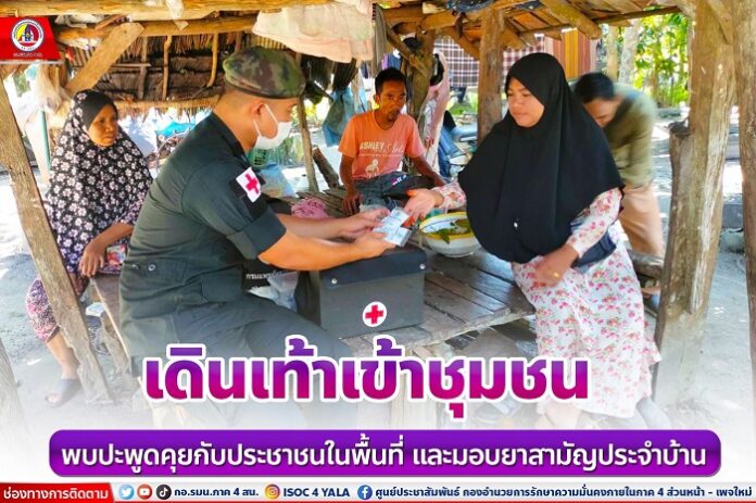 เมื่อวันที่ 25 สิงหาคม 2566 เวลา 08.30 น. กองร้อยทหารพรานนาวิกโยธินที่ 9 หน่วยเฉพาะกิจนาวิกโยธิน กองทัพเรือ จัดเจ้าหน้าที่พยาบาล พร้อมด้วยกำลังพลชุดปฏิบัติการสาธารณสุขจังหวัดฯ เดินเท้าเข้าพบปะพัฒนาสัมพันธ์กับพี่น้องประชาชนในพื้นที่ บ้านบูแม หมู่ที่ 1 ตำบลยี่งอ อำเภอยี่งอ จังหวัดนราธิวาส เพื่อพบปะให้คำแนะนำในการดูแลสุขภาพและให้บริการตรวจสุขภาพผู้สูงอายุและประชาชนถึงบ้าน พร้อมทั้งแจกจ่ายยาเวชภัณฑ์สามัญประจำบ้าน และมอบเครื่องอุปโภคบริโภคให้กับประชาชนกลุ่มเปราะบาง เพื่อเป็นการช่วยเหลือบรรเทาความเดือดร้อนในขั้นต้น ทั้งนี้ ได้ตรวจรักษาโรคเบื้องต้นให้กับประชาชนที่มารับการรักษา อีกด้วย