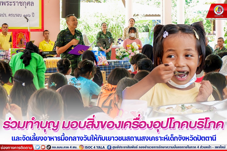 โดยในกิจกรรมดังกล่าว ได้มอบสิ่งของเครื่องอุปโภคบริโภค และจัดเลี้ยงอาหารมื้อกลางวันให้กับเยาวชนในสถานสงเคราะห์เด็กจังหวัดปัตตานี เพื่อเป็นการช่วยเหลือทำบุญให้กับเยาวชนจากทุกจังหวัดในพื้นที่ภาคใต้ ที่มีอายุตั้งแต่ 6 -18 ปี รวมทั้งเป็นเยาวชนที่มีสถานะทางครอบครัวยากลำบาก และด้อยโอกาสในด้านต่างๆ ทางสังคม โดยมี พลตรี ขจรศักดิ์ อินทร์ทอง ผู้บังคับหน่วยเฉพาะกิจปัตตานี เป็นประธานในพิธีฯ