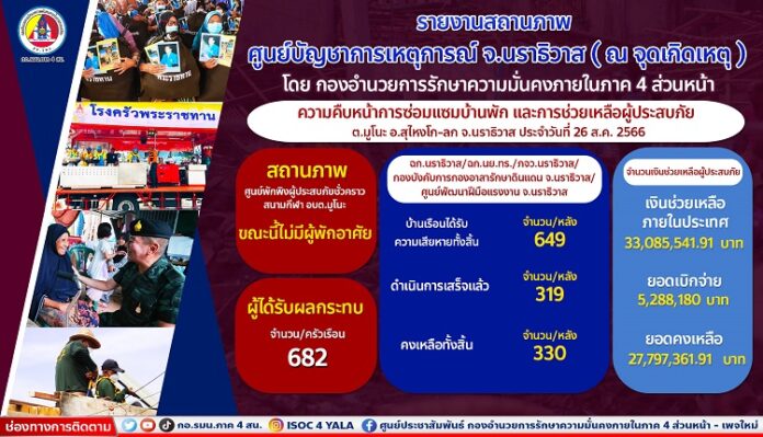 กองอำนวยการรักษาความมั่นคงภายในภาค 4 ส่วนหน้า โดยหน่วยเฉพาะกิจนราธิวาส , หน่วยเฉพาะกิจนาวิกโยธิน กองทัพเรือ, ตำรวจภูธรจังหวัดนราธิวาส ,กองบังคับการกองอาสารักษาดินแดน จังหวัดนราธิวาส และศูนย์พัฒนาฝีมือแรงงาน จังหวัดนราธิวาส เร่งดำเนินการซ่อมแซมบ้านเรือนให้กับผู้ประสบภัย เพื่อบรรเทาความเดือดร้อนแก่ผู้ประสบภัยตำบลมูโนะ อำเภอสุไหงโก-ลก จังหวัดนราธิวาส ซึ่งสรุปสถานการณ์ ณ วันที่ 26 สิงหาคม 2566 เวลา 18.00 น. ได้เร่งทำการซ่อมแซมบ้านเรือนจนแล้วเสร็จและส่งมอบแล้ว จำนวน 319 หลัง จากในจำนวนบ้านเรือนได้รับความเสียหาย 649 หลัง ยังคงเหลืออีก 330 หลัง ซึ่งเจ้าหน้าที่ยังคงเร่งดำเนินการอย่างต่อเนื่องให้เร็วที่สุด
