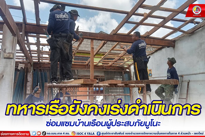 เมื่อวันที่ 27 สิงหาคม 2566 หน่วยเฉพาะกิจนาวิกโยธินกองทัพเรือ จัดกำลังพล ชุดช่างของหน่วย เร่งดำเนินการซ่อมแซมบ้านประชาชนผู้ประสบภัยจากเหตุการณ์โกดังเก็บดอกไม้ไฟ พลุ และประทัดระเบิด ที่บ้านมูโนะ ตำบลมูโนะ อำเภอสุไหงโก-ลก จังหวัดนราธิวาส เมื่อ 29 กรกฎาคม 2566 ที่ผ่านมา ทำให้ประชาชนได้รับความเสียหายทั้งชีวิตและทรัพย์สิน โดยเจ้าหน้าที่ระดมสรรพกำลังเร่งมือช่วยเหลือตั้งแต่วันเกิดเหตุจนถึงปัจจุบัน เพื่อบรรเทาความเดือดร้อนของผู้ประสบภัย และเร่งคลี่คลายสถานการณ์เพื่อให้เข้าสู่สภาวะปกติโดยเร็วที่สุด ด้านเจ้าหน้าที่ทหารเรือได้ดำเนินการ ก่อสร้างโครงหลังคา เพื่อดำเนินการมุงกระเบื้องหลังคาบ้าน นายเปาซี สาแระ จำนวน 4 หลังคาเรือน ณ บ้านเลขที่ 33/1 – บ้านเลขที่ 33/4 หมู่ที่ 1 ตำบลมูโนะ อำเภอสุไหงโก-ลก จังหวัดนราธิวาส
