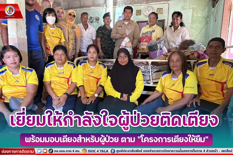 เมื่อวันที่ 28 สิงหาคม 2566 เวลา 11.00 น. กองพันทหารราบที่ 1 กรมทหารราบที่ 151 จัดกำลังพล ร่วมกับ โฆษกชาวบ้านในพื้นที่จังหวัดนราธิวาส และรองผู้บริหารโรงเรียนนราธิวาสการบริบาล ลงพื้นที่ไปยังบ้านเลขที่ 134/1 หมู่ที่ 1 ตำบลโคกเคียน อำเภอเมือง จังหวัดนราธิวาส เพื่อเยี่ยมเยียนให้กำลังใจนายมะยูนุ สาเมาะ อายุ 63 ปี ซึ่งผู้ป่วยติดเตียง พร้อมทั้งมอบเตียงสำหรับผู้ป่วยฯ ตาม “โครงการเตียงให้ยืม” และเครื่องนุ่งห่ม เครื่องอุปโภค-บริโภค โดยมี ปลัดอำเภอผู้เป็นหัวหน้าประจำตำบลโคกเคียน, ผู้ใหญ่บ้านหมู่ที่ 1 ตำบลโคกเคียน, บัณฑิตอาสา, อาสาสมัครสาธารณสุขประจำหมู่บ้าน (อสม.) ในพื้นที่ คอยอำนวยความสะดวก เพื่อเป็นกำลังใจให้กับผู้ป่วยและครอบครัว