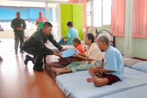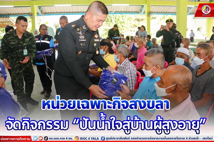 เมื่อวันที่ 29 สิงหาคม 2566 เวลา 11.00 น. ณ ศูนย์พัฒนาการจัดสวัสดิการผู้สูงอายุจังหวัดสงขลา ตำบลจะแหน อำเภอสะบ้าย้อย จังหวัดสงขลา พลตรี วรเดช เดชรักษา ผู้บังคับหน่วยเฉพาะกิจสงขลา ผู้แทน ผู้อำนวยการรักษาความมั่นคงภายในภาค 4 เป็นประธานจัดกิจกรรม “ปันน้ำใจสู่บ้านผู้สูงอายุ” โดยมอบชุดลำลอง จัดเลี้ยงอาหารกลางวัน และไอศกรีมให้กับผู้สูงอายุ พร้อมจัดกิจกรรมนันทนาการ ร่วมกับ กองร้อยอาสารักษาดินแดนอำเภอสะบ้าย้อย , กลุ่มอาสาแก้ปัญหาและพัฒนาพื้นที่ 4 อำเภอของจังหวัดสงขลา และสภานักเรียนโรงเรียนอิสลามวิทยามูลนิธิ