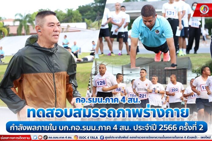 วันนี้ 30 สิงหาคม 2566 เวลา 06.00 น. ณ บริเวณโรงรถ กรมทหารราบที่ 152 ค่ายสิรินธร ตำบลเขาตูม อำเภอยะรัง จังหวัดปัตตานี พลตรี ไพศาล หนูสังข์ รองแม่ทัพภาคที่ 4 /รองผู้อำนวยการรักษาความมั่นคงภายในภาค 4 ส่วนหน้า เป็นประธานการทดสอบสมรรถภาพร่างกายกำลังพลที่ต้องทดสอบร่างกายเพื่อความพร้อมรบ (ทบ.) หรือ ACRPT โดยมี พลตรี เฉลิมพงค์ คงบัว เลขาธิการ กองอำนวยการรักษาความมั่นคงภายในภาค 4 ส่วนหน้า , รองเลขาธิการ กองอำนวยการรักษาความมั่นคงภายในภาค 4 ส่วนหน้า กำลังพลกองอำนวยการรักษาความมั่นคงภายในภาค 4 ส่วนหน้า เข้าร่วมพิธีและทดสอบสมรรถภาพร่างกาย