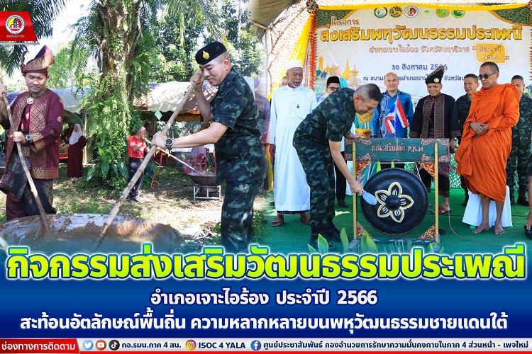 วันนี้ (30 สิงหาคม 2566) เวลา 09.00 น. ณ สนามกีฬาที่ว่าการอำเภอเจาะไอร้อง จังหวัดนราธิวาส พลโท ศานติ ศกุนตนาค แม่ทัพภาคที่ 4 / ผู้อำนวยการรักษาความมั่นคงภายในภาค 4 เป็นประธานพิธีเปิดกิจกรรมส่งเสริมวัฒนธรรมประเพณีอำเภอเจาะไอร้อง ประจำปี 2566 สะท้อนถึงอัตลักษณ์พื้นถิ่นที่มีความหลากหลายอย่างงดงามบนดินแดนพหุวัฒนธรรม โดยมี พลตรี เฉลิมพร ขำเขียว ผู้บัญชการกองพลทหารราบที่ 15 / ผู้บังคับหน่วยเฉพาะกิจจังหวัดนราธิวาส , พันเอก ภาคิณ เกื้อกูล ผู้บังคับหน่วยเฉพาะกิจกรมทหารพรานที่ 48 , นายมาหะมะยากี หะยีมะ นายอำเภอเจาะไอร้อง / ผู้อำนวยศูนย์ปฏิบัติการอำเภอเจาะไอร้อง , ส่วนราชการ , กำนัน ผู้ใหญ่บ้าน , ผู้นำศาสนา ตลอดจนประชาชนในพื้นที่ ร่วมกิจกรรม