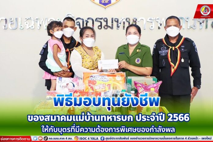 เมื่อวันที่ 2 กันยายน 2566 เวลา 13.00 น. ณ อาคารอเนกประสงค์ กองบังคับการหน่วยเฉพาะกิจกรมทหารพรานที่ 49 ตำบลซากอ อำเภอศรีสาคร จังหวัดนราธิวาส พันเอก ภาณุวัฒน์ สุคชเดช ผู้บังคับหน่วยเฉพาะกิจกรมทหารพรานที่ 49 พร้อมด้วย คุณทักษินันท์ สุคชเดช ประธานสมาคมแม่บ้านทหารบก สาขา กรมทหารพรานที่ 49 เป็นประธานในพิธีมอบทุนยังชีพของสมาคมแม่บ้านทหารบก ประจำปี 2566 จำนวน 5,000 บาท ให้กับบุตรที่มีความต้องการพิเศษ และคู่สมรสทุพพลภาพของกำลังพล จำนวน 3 ราย ประกอบด้วย เด็กชาย ชัชวิน จันทรโชตะ บุตรของ จ่าสิบตรี ภูริวัจน์ จันทรโชตะ , เด็กหญิง ภาพิมล ทองประยูร บุตรของ อาสาสมัครทหารพราน บวร ทองประยูร และนางสาว สายทิพย์ สังข์ทอง ภรรยาของ อาสาสมัครทหารพราน ณัฐพล งามขำ