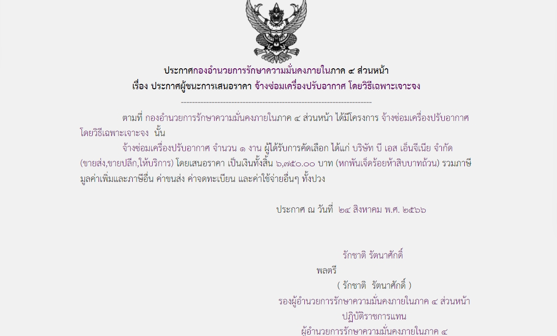 ประกาศผู้ชนะการเสนอราคา จ้างซ่อมเครื่องปรับอากาศ โดยวิธีเฉพาะเจาะจง