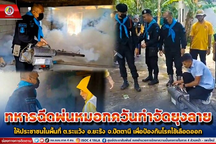 กองร้อยทหารพรานที่ 2008 หน่วยเฉพาะกิจกรมทหารพรานที่ 20 จัดกำลังพล ร่วมกับ โรงพยาบาลส่งเสริมสุขภาพตำบลระแว้ง และองค์การบริหารส่วนตำบลระแว้ง ลงพื้นที่ หมู่ที่ 6 บ้านระแว้ง ตำบลระแว้ง อำเภอยะรัง จังหวัดปัตตานี ปูพรมฉีดพ่นหมอกควันเพื่อกำจัดยุงลายในพื้นที่ตามโครงการเฝ้าระวังไข้เลือดออก สืบเนื่องจากมีการตรวจพบว่าราษฎรในพื้นที่ มีผู้ป่วยเป็นโรคไข้เลือดออกจำนวนกว่า 10 ราย จึงได้ประสานโรงพยาบาลส่งเสริมสุขภาพตำบลระแว้ง จัดเจ้าหน้าให้คำแนะนำเกี่ยวกับการรักษาสุขภาพ และวิธีการป้องกันโรคไข้เลือดออก การกำจัดลูกน้ำยุงลาย แหล่งเพาะพันธุ์ยุงลายซึ่งเป็นสาเหตุของไข้เลือดออก สำหรับกิจกรรมนี้นอกจากเป็นการป้องกันการเกิดไข้เลือดออกแล้ว ยังเป็นการสร้างความสัมพันธ์ ระหว่างเจ้าหน้าที่รัฐ และประชาชนในพื้นที่ ที่ช่วยกันดูแลด้านสาธารณสุขร่วมกัน