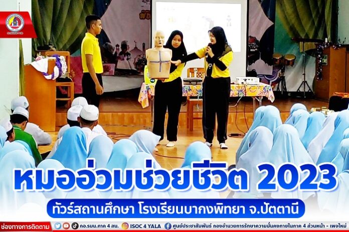 เมื่อวันที่ 6 กันยายน 2566 ณ โรงเรียนบากงพิทยา อำเภอหนองจิก จังหวัดปัตตานี โรงพยาบาลค่ายอิงคยุทธบริหาร ร่วมกับหน่วยเฉพาะกิจปัตตานี, กองพันเสนารักษ์ กรมสนับสนุน กองพลทหารราบที่ 15,หน่วยเฉพาะกิจสันติสุข และกองร้อยทหารพราน 4303 ได้ดำเนินโครงการหมออ่วมช่วยชีวิต 2023 ตามดำริของผู้บัญชาการทหารบก ในการจัดฝึกอบรมการช่วยชีวิตขั้นพื้นฐานให้กับ คณะครู และนักเรียน โดยได้ฝึกสอนการใช้เครื่องกระตุกหัวใจด้วยไฟฟ้าชนิดอัตโนมัติ การปฐมพยาบาลเบื้องต้น เพื่อเป็นการให้ความรู้ในการช่วยชีวิต ขั้นพื้นฐานแก่นักเรียน ให้สามารถดำเนินการ ช่วยฟื้นคืนชีพขั้นพื้นฐาน (CPR) และสามารถใช้เครื่องกระตุกไฟฟ้าหัวใจ ชนิดอัตโมัติ (AED) ได้อย่างถูกต้อง และปลอดภัย ซึ่งมีคณะครู และนักเรียนเข้ารับการฝึกอบรม จำนวน 91 คน