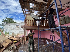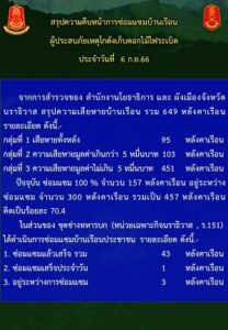 ทั้งนี้ จากความเสียหายบ้านเรือจจากเหตุการณ์ดังกล่าว มีจำนวนทั้งสิ้น 649 หลังคาเรือน ซึ่งแยกเป็น 3 กลุ่ม คือ กลุ่มที่ 1 ได้รับความเสียหายทั้งหลัง จำนวน 95 หลังคาเรือน กลุ่มที่ 2 ได้รับความเสียหายมูลค่าเกินกว่า 50,000 บาท จำนวน 103 หลังคาเรือน กลุ่มที่ 3 ได้รับความเสียหายมูลค่าไม่เกิน 50,000 บาท จำนวน 451 หลังคาเรือน ซึ่งปัจจุบันเจ้าหน้าที่ได้ดำเนินการซ่อมแซม 100% จำนวน 157 หลังคาเรือน อยู่ในระหว่างซ่อมแซม จำนวน 300 หลังคาเรือน รวมเป็น 457 หลังคาเรือน คิดเป็นร้อยละ 70.4 ในส่วนของชุดช่างทหารบก ได้ดำเนินการซ่อมแซมบ้านเรือนแล้วเสร็จแล้ว รวม 43 หลังคาเรือน ซ่อมแซมเสร็จประจำวัน 1 หลังคาเรือน และอยู่ระหว่างการซ่อมแซม 3 หลังคาเรือน ซึ่งเจ้าหน้าที่ยังคงเร่งดำเนินการให้เร็วที่สุด