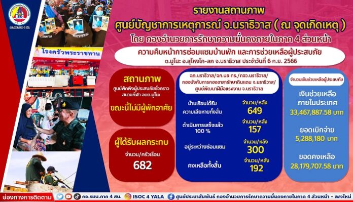 จากเหตุการณ์โกดังเก็บดอกไม้เพลิงระเบิด ที่ ต.มูโนะ อ.สุไหงโก-ลก จ.นราธิวาส สร้างความเสียหายทั้งชีวิตและทรัพย์สินของประชาชนที่พักอาศัยอยู่บริเวณโดยรอบกว่า 680 ครัวเรือน ตลอดระยะเวลาตั้งแต่เมื่อวันที่ 29 กรกฎาคม 2566 จนถึงปัจจุบัน กองอำนวยการรักษาความมั่นคงภายในภาค 4 ส่วนหน้า โดย หน่วยเฉพาะกิจนราธิวาส, หน่วยเฉพาะกิจนาวิกโยธิน กองทัพเรือ, ตำรวจภูธรจังหวัดนราธิวาส, กองบังคับการกองอาสารักษาดินแดน จังหวัดนราธิวาส และทุกภาคส่วนในพื้นที่จังหวัดนราธิวาส เข้าให้การช่วยเหลือผู้ประสบภัยเพื่อบรรเทาความเดือนร้อน โดยเฉพาะในด้านการซ่อมแซมที่พักอาศัยที่ได้รับความเสียหายจำนวน 649 หลัง ล่าสุด เจ้าหน้าที่เร่งมือซ่อมแซมบ้านเรือนผู้ประสบภัยมูโนะ ปัจจุบัน (7 กันยายน 2566) ดำเนินการซ่อมแซมแล้วเสร็จ 100% จำนวน 157 หลัง อยู่ในระหว่างซ่อมแซมอีกจำนวน 300 หลัง ในส่วนหลังคาเรือนที่ได้รับความเสียหายทั้งหลัง ขณะนี้ได้ดำเนินการถมดินแล้ว จำนวน 8 หลัง คงเหลืออีกจำนวน 86 หลัง ซึ่งเจ้าหน้าที่ยังคงเร่งดำเนินการให้เร็วที่สุด นอกจากนี้ยังได้ลงพื้นที่เยียวยาทางด้านสภาพจิตใจ รวมถึงการส่งเสริมในด้านอาชีพเพื่อสร้างรายได้ในการเลี้ยงชีพและครอบครัวอย่างยั่งยืนอีกด้วย