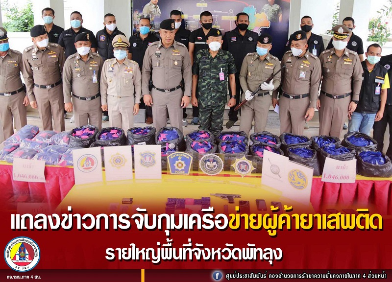 เมื่อวันที่ 2 พฤศจิกายน 2563 เวลา 11.00 น. ที่สถานีตำรวจภูธรจังหวัดพัทลุง พลโท สิทธิพร มุสิกะสิน รองผู้อำนวยการรักษาความมั่งคงภายในภาค 4 ส่วนหน้า ร่วมแถลงข่าวการจับกุมเครือข่ายผู้ค้ายาเสพติดรายใหญ่ในพื้นที่จังหวัดพัทลุง พร้อมของกลาง ยาบ้า จำนวน 1,046,000 เม็ด โดยสามารถจับกุมผู้ต้องหา จำนวน 2 ราย คือ นายนนท์ธวัช ช่วยสถิต อายุ 36 ปี บ้านเลขที่ 93 หมู่ 5 ตำบลเกาะเต่า อำเภอป่าพะยอม และ นายธรรมพร เขี้ยวแก้ว อายุ 23 ปี บ้านเลขที่ 265 หมู่ 9 ตำบลบ้านพร้าว อำเภอป่าพะยอม พร้อมของกลาง อาวุธปืนพกสั้น ยี่ห้อ NORINCO ขนาด 9 มิลลิเมตร จำนวน 1 กระบอก, อาวุธปืนยาว ยี่ห้อ MARLIN FIRERMS ขนาด .357 MAG จำนวน 1 กระบอก, รถยนต์กระบะ จำนวน 1 คัน และโทรศัพท์มือถือ จำนวน 3 เครื่อง ทั้งนี้การจับกุมผู้ค้ายาเสพติดรายใหญ่ดังกล่าวเป็นผลสืบเนื่องจากการขยายผล การจับกุมผู้ต้องหาค้ายาเสพติดรายใหญ่ในพื้นที่จังหวัดปัตตานี ณ จุดตรวจด่านเกาะหม้อแกง ตำบลท่ากำชำ อำเภอหนองจิก จังหวัดปัตตานี จากการสนธิกำลังของเจ้าหน้าที่ 3 ฝ่าย เจ้าหน้าที่ทหาร เจ้าหน้าที่ตำรวจ และฝ่ายปกครอง ที่ปฏิบัติหน้าที่ประจำจุดตรวจ เมื่อวันที่ 27 ตุลาคม 2563 ที่ผ่านมา โดยได้ร่วมกันตรวจค้น จับกุมเครือข่ายผู้ค้ายาเสพติดรายใหญ่ในพื้นที่จังหวัดปัตตานี พร้อมของกลางยาบ้า จำนวน 20,977 เม็ด อาวุธปืน จำนวน 1 กระบอก และของกลางอื่น ๆ อีกจำนวนหลายรายการ จากการสืบสวนขยายผลทราบว่ามีเครือข่ายผู้ค้ายาเสพติดในพื้นที่จังหวัดพัทลุง ร่วมกับเครือข่ายในพื้นที่ 3 จังหวัดชายแดนภาคใต้ ลักลอบลำเลียงยาเสพติดจากประเทศเพื่อนบ้านทางภาคเหนือส่งจำหน่ายให้เครือข่ายในพื้นที่ภาคใต้ และยังมียาเสพติดอีกเป็นจำนวนมาก ที่พักแอบซ่อนอยู่ในพื้นที่ อำเภอป่าพะยอม จังหวัดพัทลุง จนกระทั่งเมื่อวันที่ 28 ตุลาคม 2563นั้น สามารถจับกุมเครือข่ายผู้ค้ายาเสพติด พร้อมของกลาง บริเวณศาลาที่พักผู้โดยสารหน้ามหาวิทยาลัยชื่อดัง วิทยาเขตพัทลุง หมู่ 2 ตำบลบ้านพร้าว อำเภอป่าพะยอม จังหวัดพัทลุง ขณะนำยาเสพติดมาส่งมอบให้กับเครือข่าย โดยเจ้าหน้าที่ตำรวจ จะดำเนินการ ตามกฎหมายต่อไป