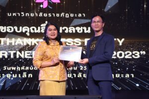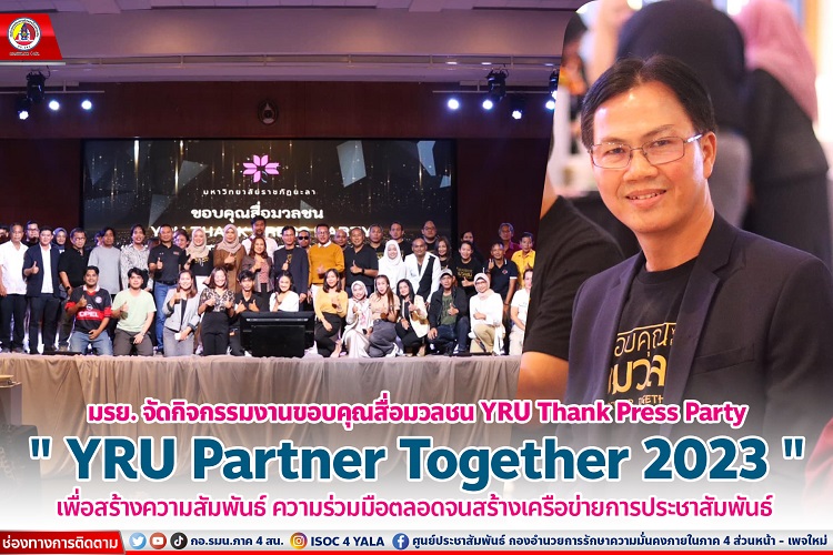 เมื่อวันที่ 7 กันยายน 2566 เวลา 18.30 น. ณ หอประชุมเล็ก มหาวิทยาลัยราชภัฏยะลา ผู้ช่วยศาสตราจารย์ ดร.ศิริชัย นามบุรี รักษาราชการแทนอธิการบดีมหาวิทยาลัยราชภัฏยะลา ร่วมงานขอบคุณสื่อมวลชน YRU Thank Press Party “YRU Partner Together 2023 ” เพื่อสร้างความสัมพันธ์ ความร่วมมือตลอดจนสร้างเครือข่ายการประชาสัมพันธ์ แลกเปลี่ยนข้อมูลข่าวสารความคิดเห็นเกี่ยวกับการดำเนินงานและการพัฒนา มหาวิทยาลัย และเพื่อขอบคุณสื่อมวลชนทุกแขนง นักประชาสัมพันธ์ และเครือข่ายประชาสัมพันธ์ที่เป็น สื่อกลางในการนำเสนอข่าวสาร ตลอดจนสนับสนุนมหาวิทยาลัยราชภัฏยะลามาตลอด โดยมี สื่อมวลชนจังหวัดยะลา คณะผู้จัด คณาจารย์ นักศึกษา เข้าร่วมงานเป็นจำนวนมาก บรรยากาศเป็นไปด้วยความอบอุ่น