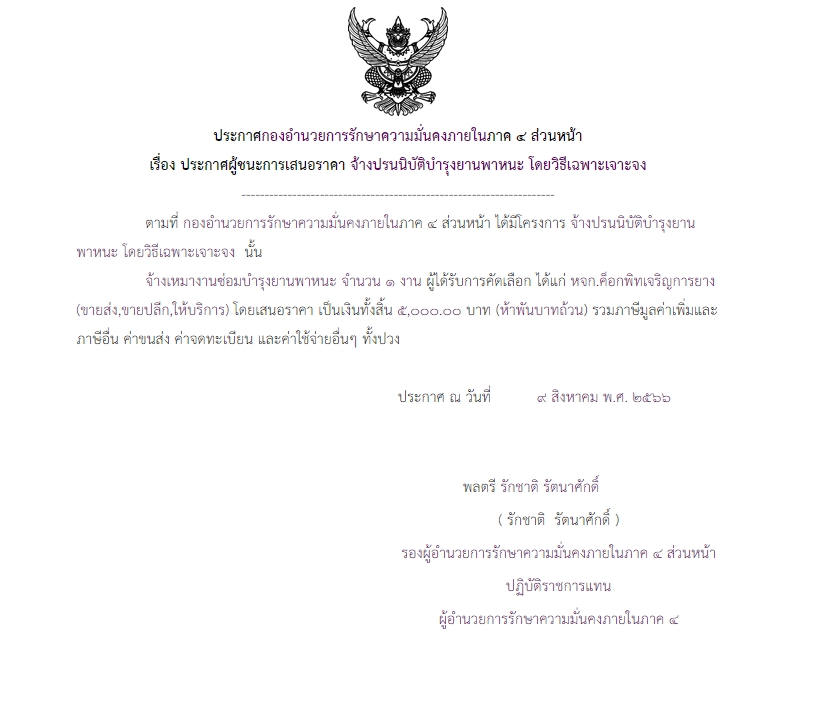 ประกาศผู้ชนะการเสนอราคา จ้างปรนนิบัติบำรุงยานพาหนะ โดยวิรีเฉพาะเจาะจง