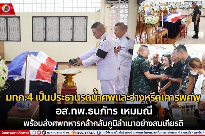 วันนี้ ( 8 กันยายน 2566) เวลา 10.00 น. ที่ วัดบางนรา ตำบลบางนาค อำเภอเมืองนราธิวาส จังหวัดนราธิวาส พลโท ศานติ ศกุนตนาค แม่ทัพภาคที่ 4/ ผู้อำนวยการรักษาความมั่นคงภายในภาค 4 เป็นประธานพิธีรดน้ำศพ และพิธีส่งศพ สดุดี อาสาสมัครทหารพราน ธนภัทร เหมมณี ตำแหน่ง พลยิงเครื่องยิงจรวด เจ้าหน้าที่ทหารพรานชุดพิทักษ์พื้นที่ กองร้อยทหารพรานที่ 4808 หน่วยเฉพาะกิจกรมทหารพรานที่ 48 อายุ 24 ปี ซึ่งเสียชีวิตจากเหตุคนร้ายไม่ทราบจำนวนลอบวางระเบิด ขณะทำการลาดตระเวนพื้นที่รับผิดชอบ เหตุเกิดในพื้นที่บริเวณ บ้านสากอ หมู่ 4 ตำบลสากอ อำเภอสุไหงปาดี จังหวัดนราธิวาส เมื่อวันที่ 7 กันยายน 2566 ที่ผ่านมา