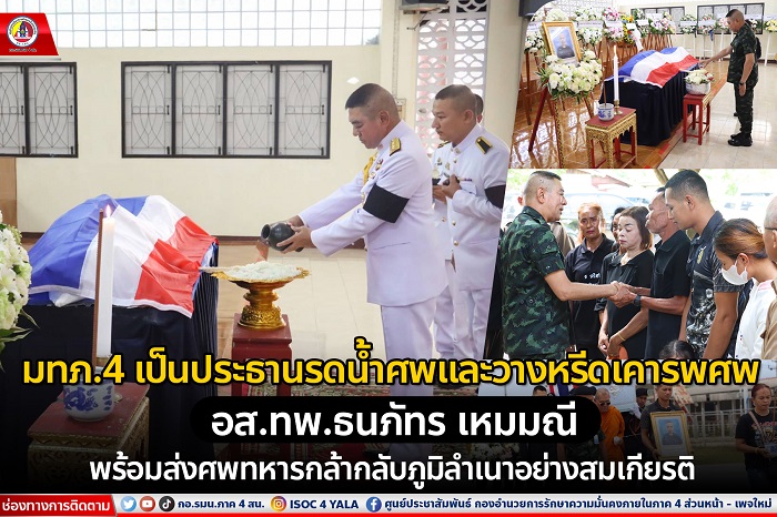 ทั้งนี้ กองอำนวยการรักษาความมั่นคงภายในภาค 4 ส่วนหน้า ประกอบด้วย ข้าราชการ ทหาร ตำรวจ พลเรือนและประชาชนทุกคน ขอแสดงความเสียใจอย่างสุดซึ้งต่อการจากไปของวีรชนผู้กล้า และขอสดุดีต่อท่านที่ปฎิบัติหน้าที่ด้วยความเสียสละ ทุ่มเท ตอบแทนบุญคุณแผ่นดินอย่างยิ่งใหญ่ และขอให้ดวงวิญญาณของ “อส.ทพ. ธนภัทร เหมมณี”จงถึงสุคติภพ ประสพสุขในสรวงสวรรค์ แม้ชีพของท่านจะสูญสิ้น แต่คุณงามความดีและเกียรติประวัติแห่งความเสียสละจะยังคงอยู่ตราบนานเท่านาน