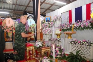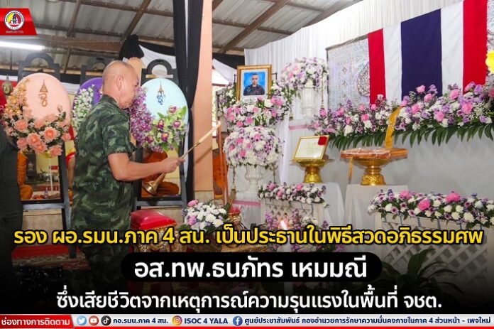เมื่อวันที่ 10 กันยายน 2566 เวลา 17.00 น. ที่ วัดบาโหย อำเภอสะบ้าย้อย จังหวัดสงขลา พลตรี กรกฎ ภู่โชติ รองผู้อำนวยการรักษาความมั่นคงภายในภาค 4 ส่วนหน้า / ผู้บัญชาการกองพลพัฒนาที่ 4 เป็นประธานในพิธีสวดอภิธรรมศพ อาสาสมัครทหารพราน ธนภัทร เหมมณี เจ้าหน้าที่ทหารพรานชุดพิทักษ์พื้นที่ กองร้อยทหารพรานที่ 4808 หน่วยเฉพาะกิจกรมทหารพรานที่ 48 ซึ่งเสียชีวิตจากเหตุคนร้ายลอบวางระเบิด ในพื้นที่ ตำบลสากอ อำเภอสุไหงปาดี จังหวัดนราธิวาส เมื่อวันที่ 7 กันยายน 2566 ที่ผ่านมา โดยมี พันเอก สฐิรพงษ์ อาจหาญ ผู้บังคับกองกำลังทหารพรานจังหวัดชายแดนภาคใต้ พร้อมด้วย พันเอก ภิญโญ ป้านทอง รองผู้บังคับกองกำลังทหารพรานจังหวัดชายแดนภาคใต้ และกำลังพล รวมไปถึงญาติพี่น้อง และประชาชนในพื้นที่ เข้าร่วมพิธีสวดพระอภิธรรมศพ แสดงความไว้อาลัยต่อวีรชนผู้กล้า