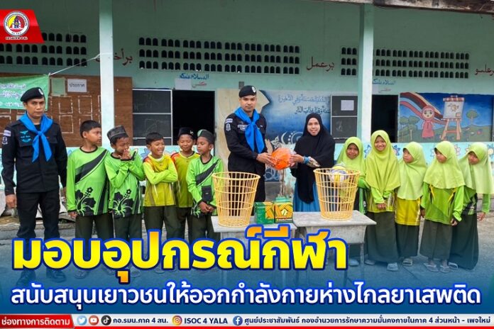 เมื่อวันที่ 10 กันยายน 2566 เวลา 08.30 น. ชุดปฏิบัติการกิจการพลเรือน กองร้อยทหารพรานที่ 4106 หน่วยเฉพาะกิจกรมทหารพรานที่ 41 เข้าพบปะพัฒนาสัมพันธ์ ครู และเด็กนักเรียน โรงเรียนตาดีกายันนาตุลมะวา บ้านแอร้อง หมู่ที่ 10 ตำบลตาเนาะปูเต๊ะ อำเภอบันนังสตา จังหวัดยะลา พร้อมทั้งมอบอุปกรณ์กีฬา เพื่อสนับสนุนให้เด็กนักเรียนรู้จักใช้เวลาว่างให้เป็นประโยชน์ มีสุขภาพร่างกายแข็งแรง ห่างไกลจากยาเสพติด อีกทั้งยังเป็นการปลูกฝังเยาวชนในเรื่องความรัก ความสามัคคี รู้แพ้ รู้ชนะ รู้อภัย ตามนโยบายการเสริมสร้างภูมิคุ้มกัน เเละสันติสุขในพื้นที่จังหวัดชายแดนใต้