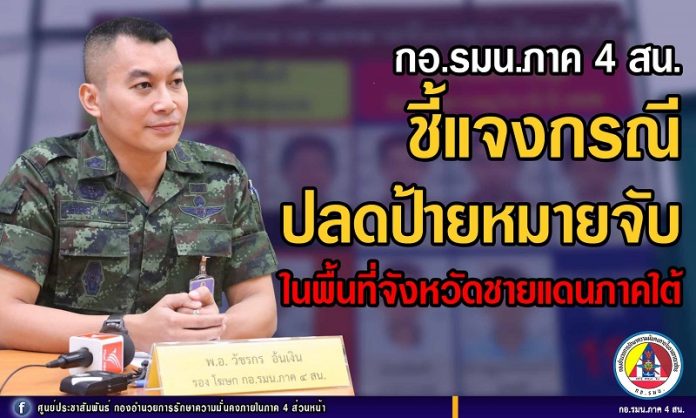 วันนี้ ( 3 พ.ย. 63 ) พันเอก วัชรกร อ้นเงิน รองโฆษก กองอำนวยการรักษาความมั่นคงภายในภาค 4 ส่วนหน้า เปิดเผยถึงกรณีดังกล่าวว่า การปลดป้ายบุคคลตามหมายจับเป็นไปตามนโยบายสั่งการของ พลโท เกรียงไกร ศรีรักษ์ แม่ทัพภาคที่ 4/ ผู้อำนวยการรักษาความมั่นคงภายในภาค 4 จริง โดยได้สั่งการในโอกาสประชุมประจำสัปดาห์ของกองอำนวยการรักษาความมั่นคงภายในภาค 4 ส่วนหน้า เมื่อวันที่ 26 ตุลาคม 63 ที่ผ่านมา และได้ประสานไปยังกองกำลังตำรวจจังหวัดชายแดนภาคใต้ ซึ่งเป็นหน่วยรับผิดชอบหลักในการดำเนินการจัดทำป้ายประกาศดังกล่าว และหน่วยเฉพาะกิจในพื้นที่ ให้มีการปลดป้ายบุคคลตามหมายจับคดีความมั่นคงในพื้นที่ลง หรือนำออก โดยให้มีการตรวจสอบและพิจารณา ปรับปรุง หรือ อัพเดท บุคคล ตามหมายจับ ให้มีความทันสมัยเป็นปัจจุบัน ซึ่งที่ผ่านมาอาจจะมีบุคคลภายในป้ายประกาศ ได้เสียชีวิต หรือ ถูกศาลพิพากษาดำเนินคดีไปแล้ว และหากป้ายประกาศนำจับ ยังคงมีรูปบุคคลดังกล่าวอยู่ อาจส่งผลกระทบทางด้านจิตใจกับครอบครัวญาติพี่น้อง ซึ่งทางแม่ทัพภาคที่ 4 / ผู้อำนวยการรักษาความมั่นคงภายในภาค 4 ได้ให้ความสำคัญในส่วนนี้เป็นอย่างมาก ทั้งนี้ต้องขอขอบคุณทางท่าน ส.ส.อาดิลัน ที่ช่วยกันเป็นหูเป็นตาเป็นกระบอกเสียงให้กับพี่น้องประชาชนอีกช่องทางหนึ่งด้วย